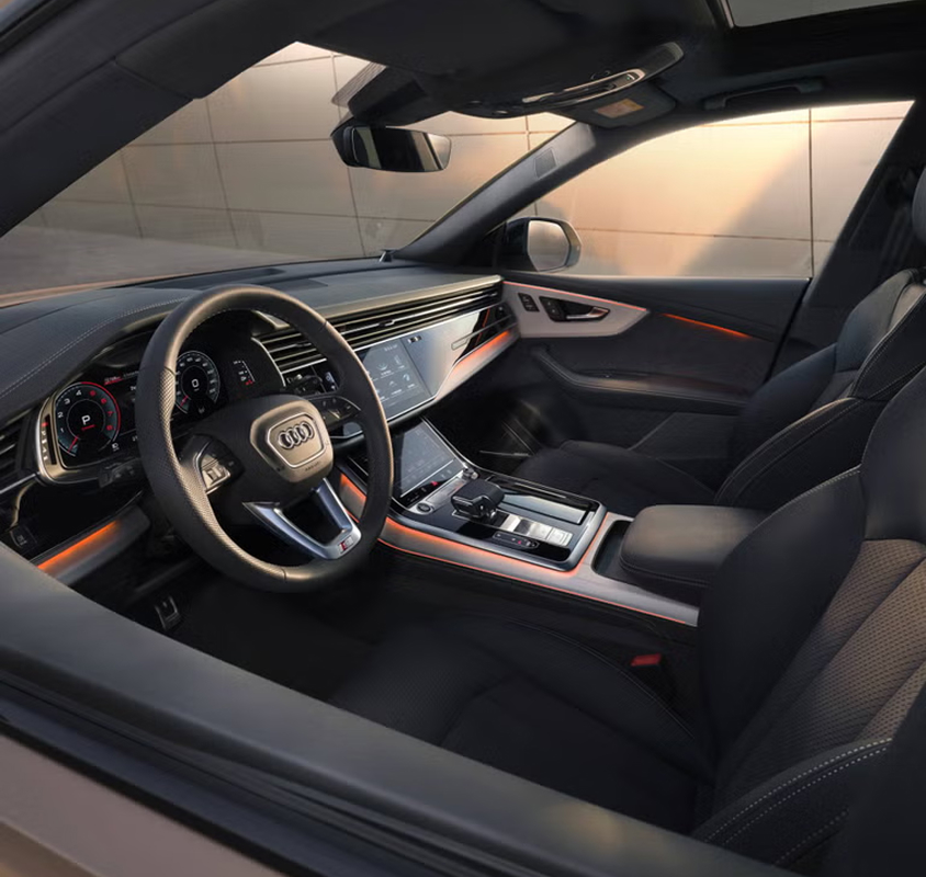 The Audi Q8 SUV combines the elegance of a four-door luxury coupé with the versatility of an SUV. The sporty interior conveys luxurious charm; and together with the sliding rear seat bench plus, it offers even more space in the rear.